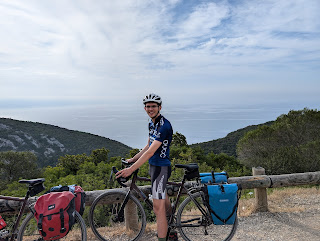 After a fairly gentle first stretch, we soon got going, climbing a small mountain, part of the Serra da Arrábida. It was a good workout for the legs and very satisfying to get high up, even with the added weight of the panniers. There were plenty of other Saturday morning cyclists heading up or down, but none of them had much with them compared to us! We were rewarded with spectacular views out over the sea.
